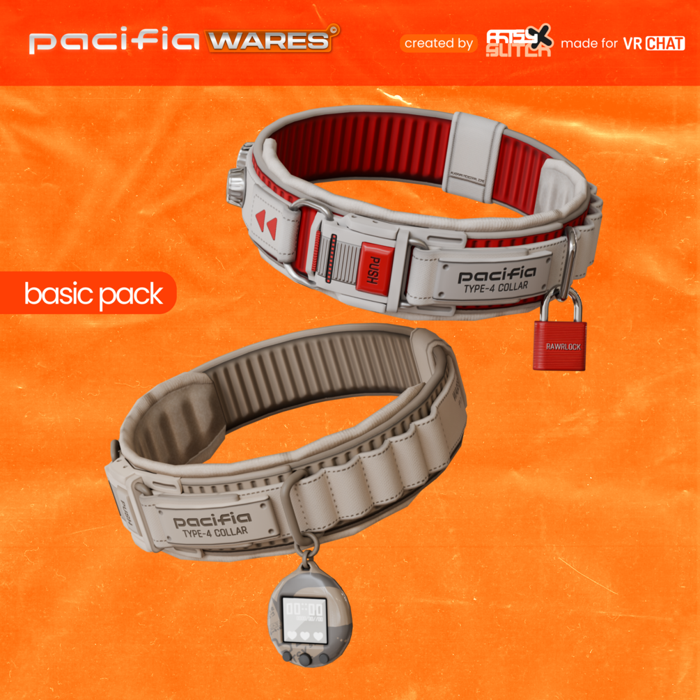 The T4 Collars, part of the Pacifia Type series, include 5 interchangeable charms; a bell, name-tag, padlock, mini speaker and a miniature handheld device! All charms are interchangeable via blendshapes and can be toggled on//off in-game to customize to your current mood! Default setup includes physbones and basic audiolink settings!