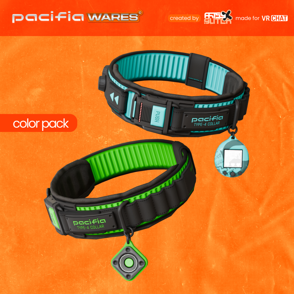 The T4 Collars, part of the Pacifia Type series, include 5 interchangeable charms; a bell, name-tag, padlock, mini speaker and a miniature handheld device! All charms are interchangeable via blendshapes and can be toggled on//off in-game to customize to your current mood! Default setup includes physbones and basic audiolink settings!